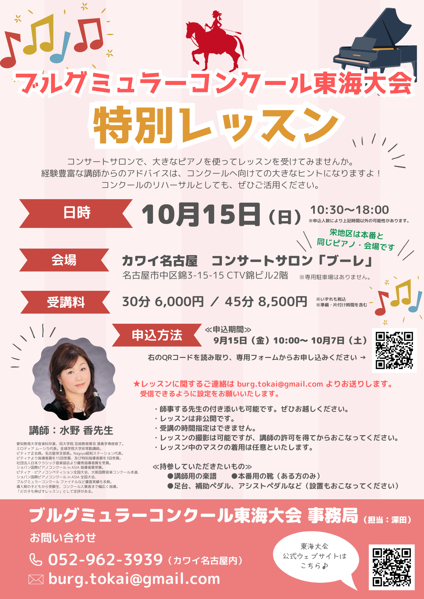ブルグミュラーコンクール本番に向け、東海大会の参加者を対象に特別レッスンを開催することになりました。